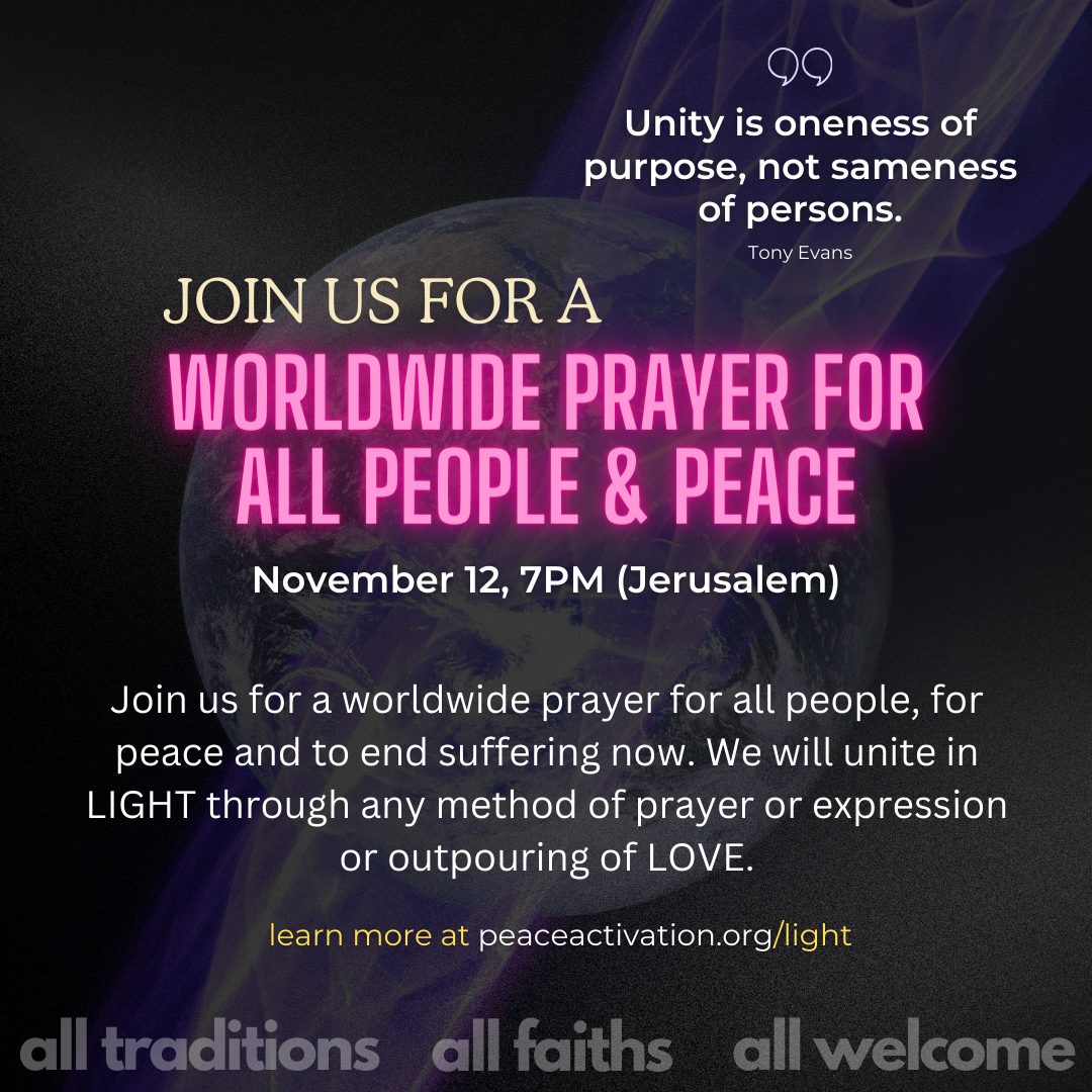On Sunday, November 12 at 7pm Jerusalem time, we will be united in LIGHT through any method of prayer or expression or outpouring of LOVE that you wish to contribute.